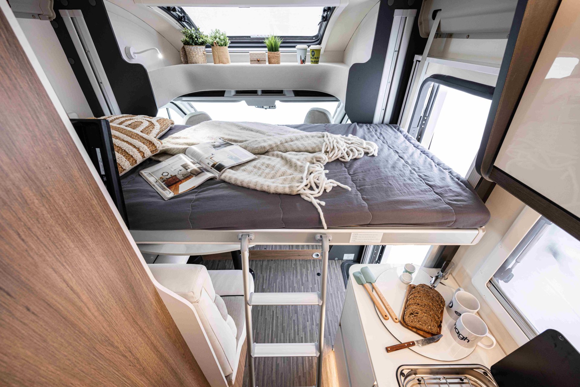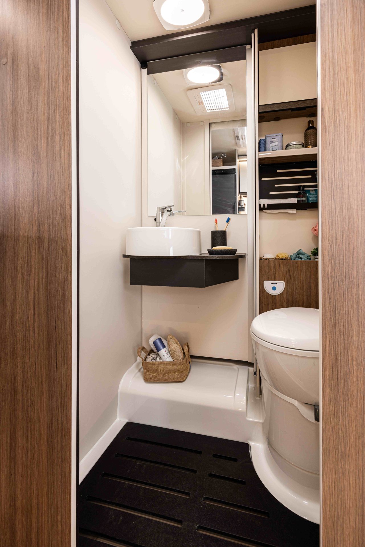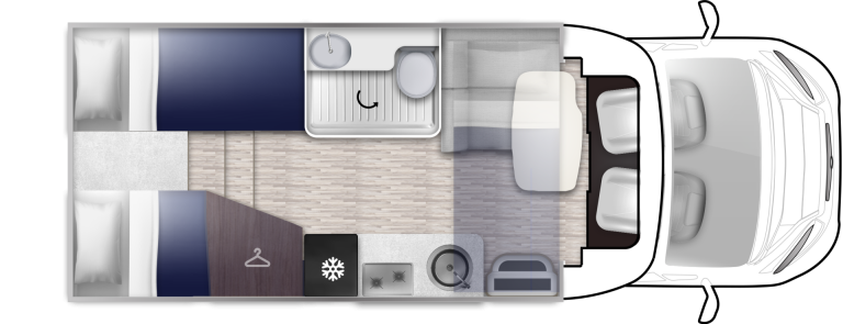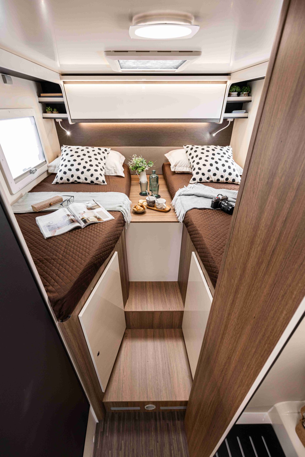 Semi-integrale di nuova generazione, telaio Ford transit 2.0cc 165 cv, Euro 6 E Bis tappezzeria “GAZE”, serbatoio 70lt, omologato 4 posti viaggio, 2+2 posti letto, sistema letti gemelli in coda e letto basculante sulla dinette, lunghezza 6.69m, altezza 2,85m, larghezza 215m, dotato di riscaldamento Truma Combi 4 a gas con sistema CpPlus, Wc a cassetta, bagno a volume variabile con lavabo ruotabile, frigorifero trivalente automatico 137L, dinette integrata con la cabina.