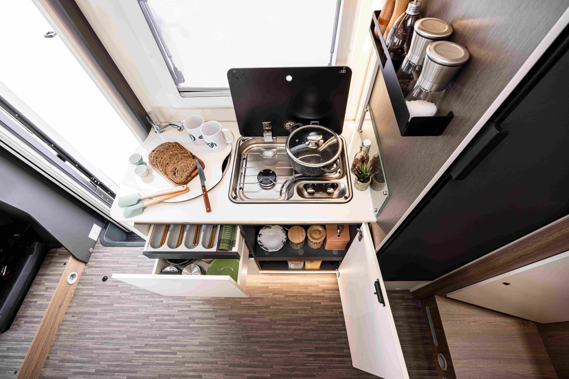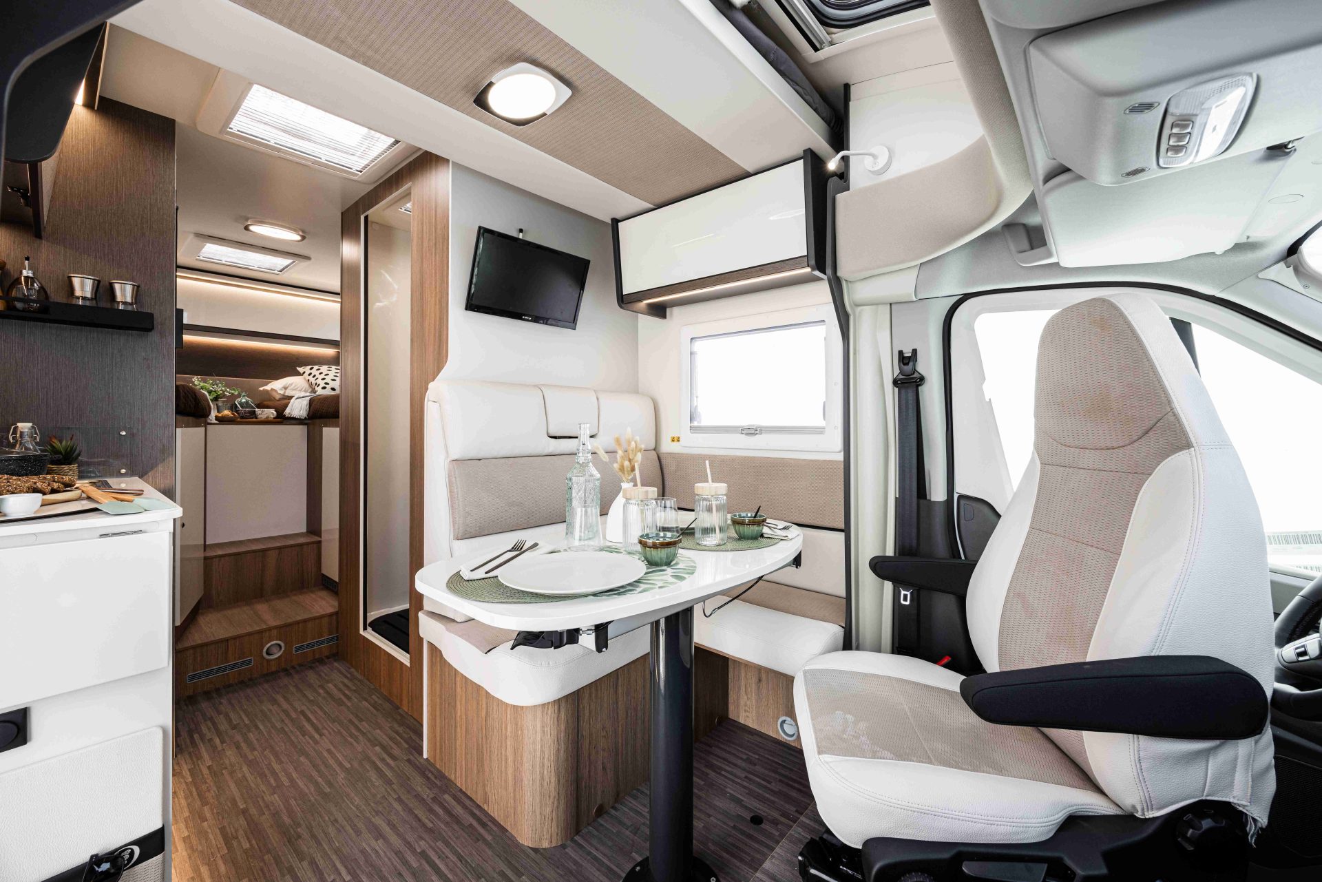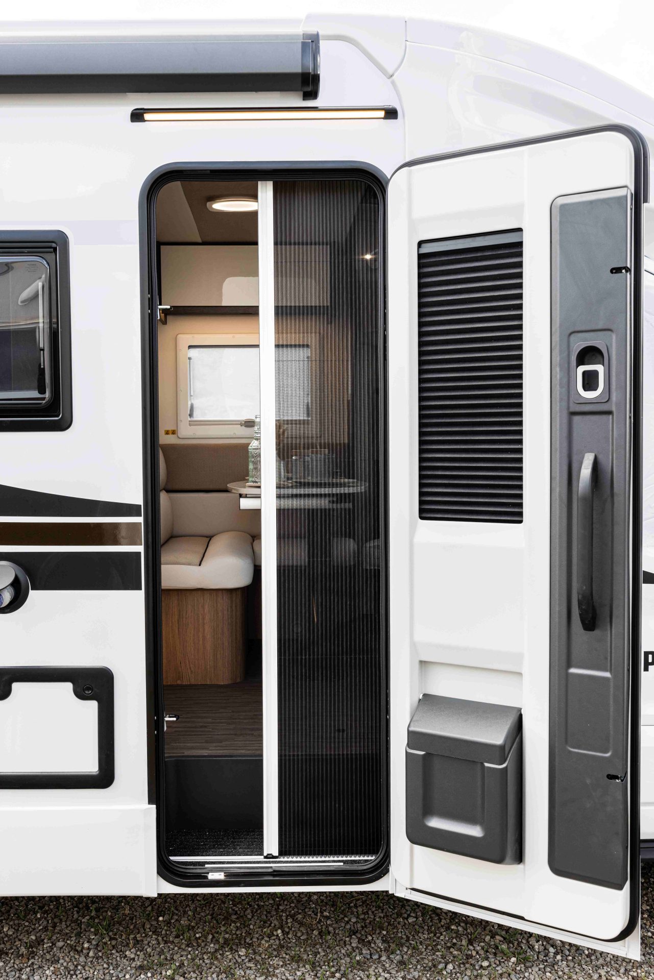 - Pack Compact ( Fari High Series con luci di svolta statiche, cassetto portaguanti con serratura- rivestimenti interni e plancia strumenti “Trend”, paraurti e modanatura in tinta, Porta XL con finestra e chiusura centralizzata, CP-Plus, Sktroof, coprilavello, braccio TV, sedili abbinati alla tappezzeria, pannello fotovoltatio 200 W con MPPT, oscuranti plissettati.
